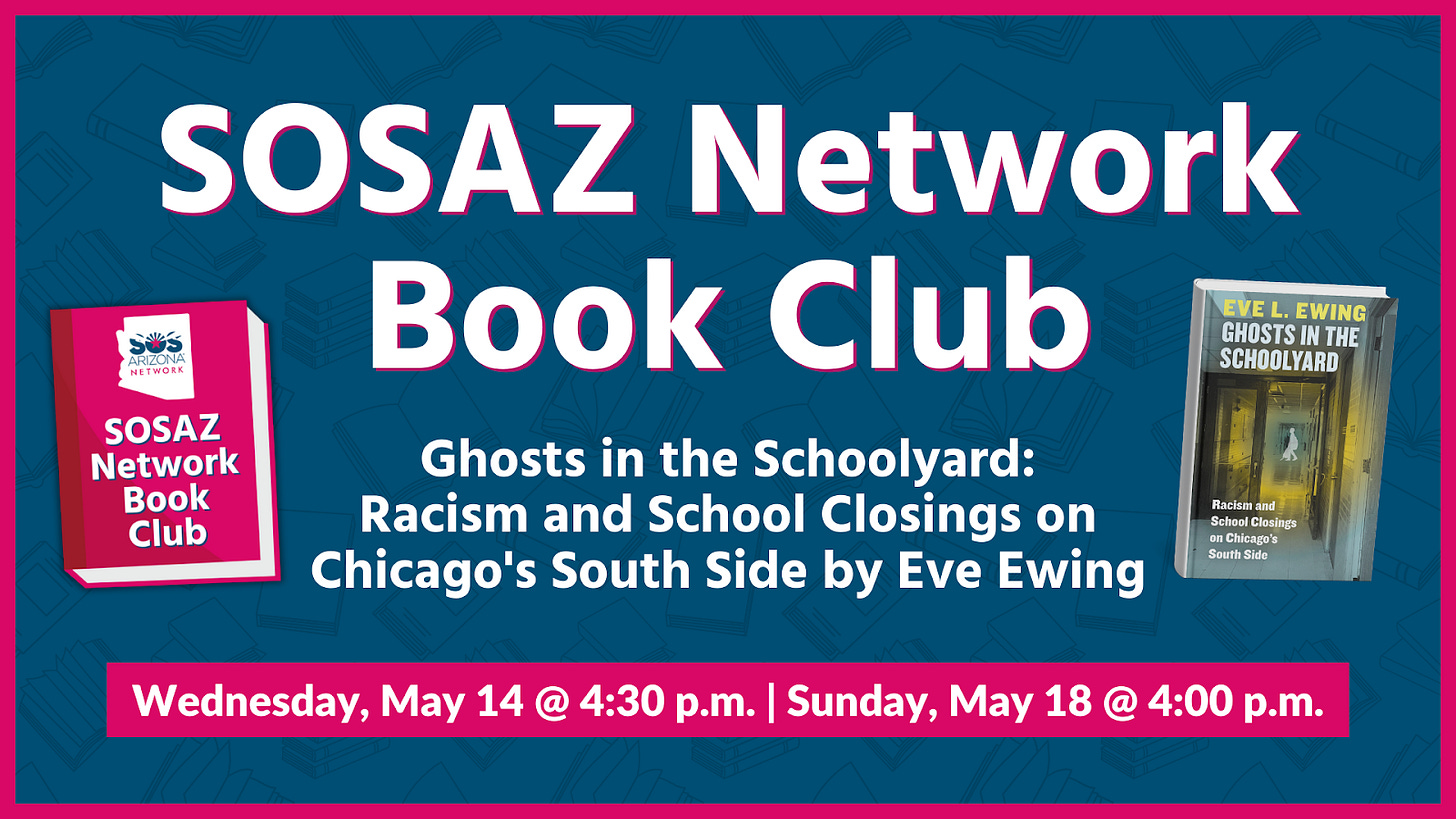 Book Club is BACK Join Save Our Schools Arizona Network for our May Book Club to discuss Eve Ewing’s Ghosts in the Schoolyard: Racism and School Closings on Chicago’s South Side THIS Sunday, May 18 for a final book discussion from 4:00-5:00pm. Register here!